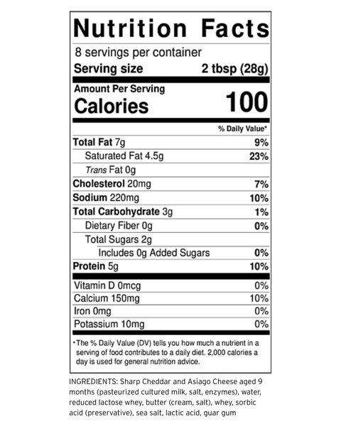 We take our finest aged Asiago, prized for its uniquely nutty and savory character, and whip it into a wonderfully soft, spreadable form. The result is a profound flavor experience that is a heartfelt expression of our family’s passion for creating distinctive, high-quality cheeses meant to be at the center of your shared celebrations.
