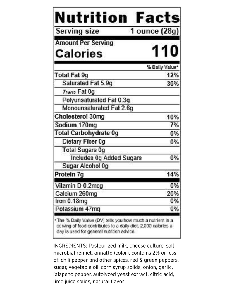 Our Chili Lime Cheddar will captivate your senses! It starts with the citrus aroma, followed by the taste of zesty lime. The cheddar bursts with flavor and, finally, the mild heat of chilis. The fervor of these flavors will make an irresistible Mexican cuisine!