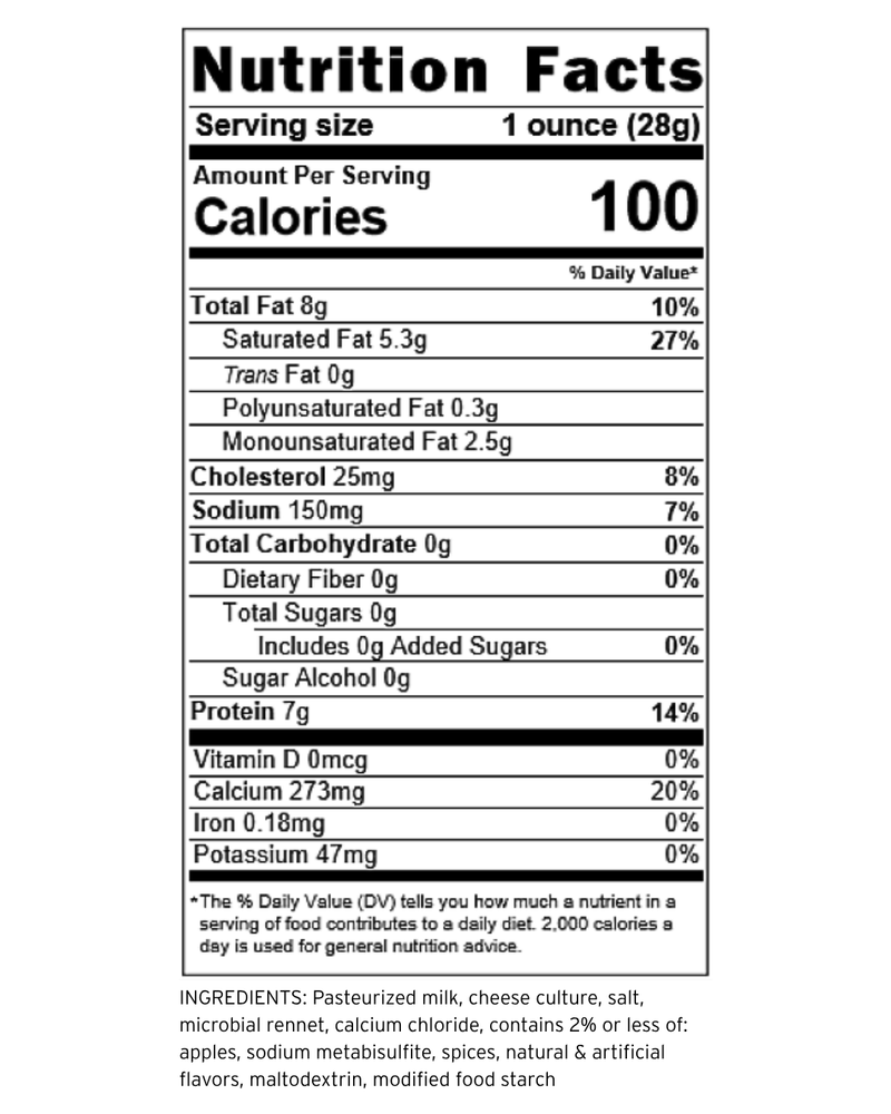 We start with our classic, buttery Monterey Jack, beloved for its mild character and exceptionally smooth texture. We then infuse it with sweet pieces of apple and a warm touch of cinnamon, creating a delightful harmony that tastes just like home. This charming blend is a sweet reflection of our family's tradition of crafting unique, high-quality cheeses meant for your family to share and enjoy.
