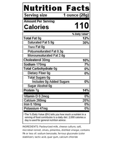 Bold and Briny: Experience a firm yet creamy texture dotted with tender olive pieces. The initial sharp cheddar flavor is beautifully complemented by a wave of salty, savory olive taste, creating a balanced and mouthwatering finish. It is a robust and deeply satisfying flavor that feels both classic and adventurous, perfect for sharing over good conversation.