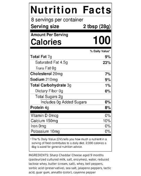 We start with a rich, savory cheese base, whipped to a perfectly smooth and creamy texture. Then, we fold in generous pieces of real jalapeno peppers, infusing the spread with their distinctive, vibrant heat. This lively combination is a spirited expression of our family’s passion for crafting unique, high-quality cheeses meant for your family to enjoy together.