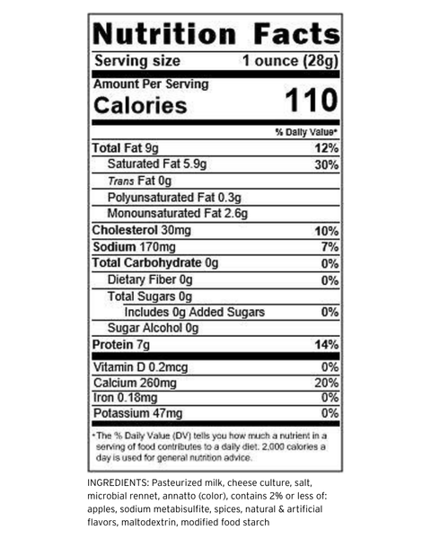 Welcome the cozy feeling of autumn into your home with Renard's Artisan Apple Cinnamon Cheddar. This cheese captures the essence of a crisp fall day, blending savory cheddar with the comforting spices of the season. It’s the perfect, heartwarming flavor to enjoy by the fire or to add a special touch to a family brunch.