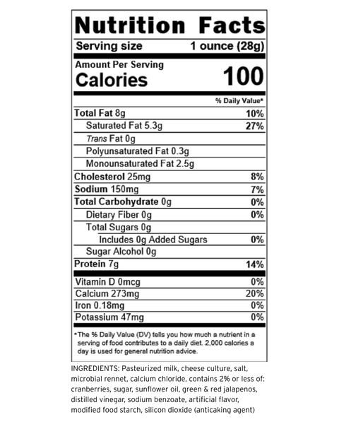 Sweet with a Hint of Heat: A supple, creamy texture gives way to the familiar, mild character of Monterey Jack, followed by a bright burst of sweet-tart cranberry and a gentle, zesty kick of jalapeño. It’s a playful and sophisticated flavor experience that is both unexpected and utterly delicious.