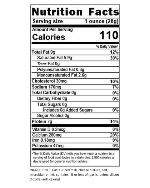 We take our rich, sharp white cheddar and infuse it with the timeless combination of savory onion and robust garlic. This process marries the cheddar's clean, tangy bite with a deep, satisfying savoriness that feels both familiar and special. This flavorful blend is a heartfelt expression of our family’s passion for creating cheeses that taste like home.